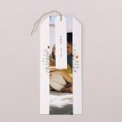 Touwkaart samengesteld uit drie kleine kaartjes die recto-verso te bewerken zijn. De kaartjes worden samengebonden met een lintje naar keuze (optioneel).