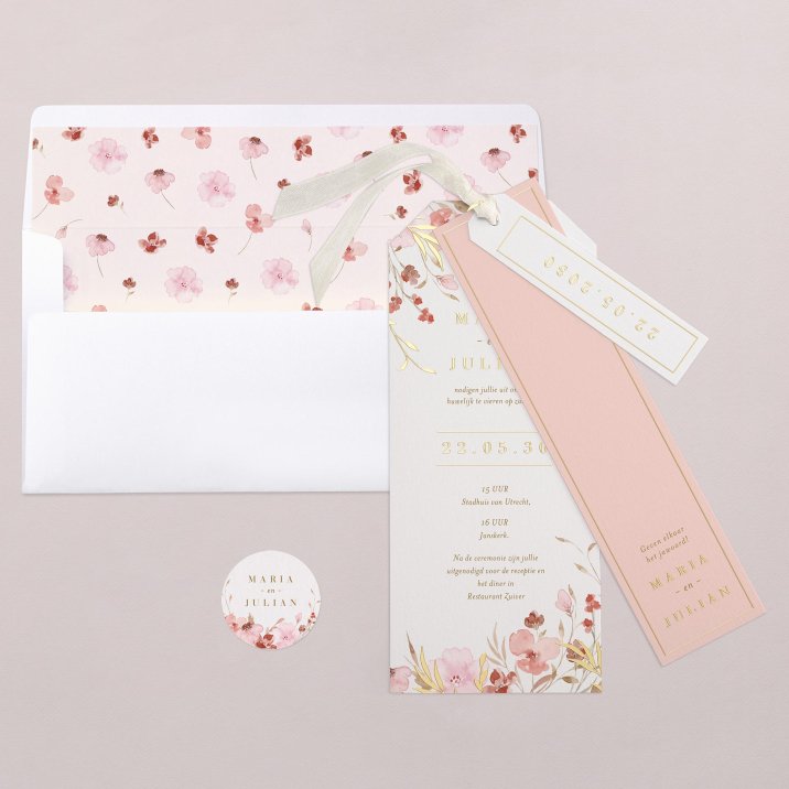 Aquarelsamenstelling van bloemen, delicate gouden accenten: de trouwkaart Rosalia schildert een romantisch tafereel in roze tinten, perfect om jullie mooie dag aan te kondigen aan degenen die je liefhebt.