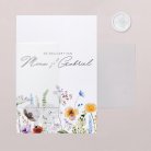 Mooie wilde bloemen schetsen zich af op de trouwkaart Wildery. Deze poëtische samenstelling, verfraaid met elegante typografie, is perfect voor het vieren van een bohemien-themabruiloft.