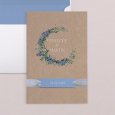 Een bloemrijke boog in blauwe tinten, namen gekleed in verfijnde typografie, kraftachtig papier: de trouwkaart Azzura kondigt een plattelandse viering aan die je niet mag missen.