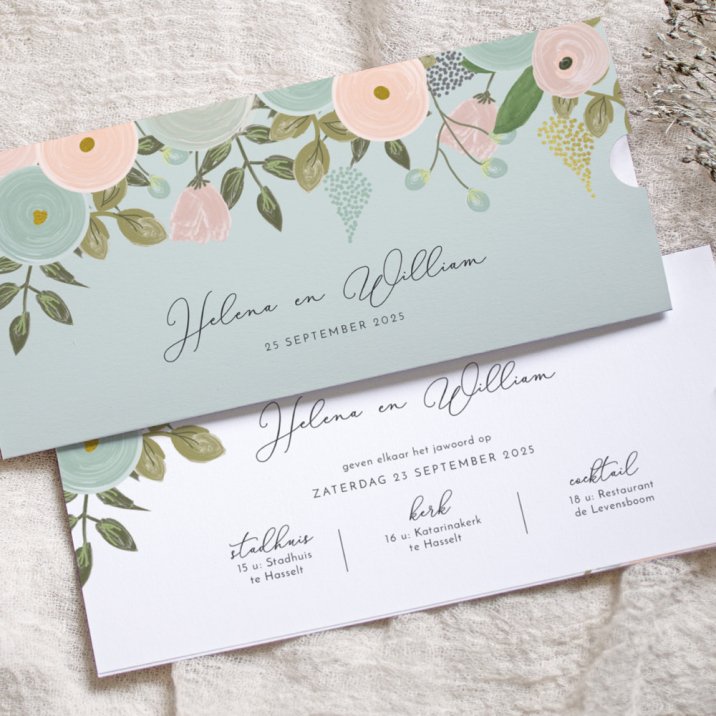 Zachte pasteltinten, gestilleerde bloemen, trendy handschrift... onthul jullie trouwplannen met tederheid. Verras jullie gasten met dit zachtliefelijk model Seladon.
