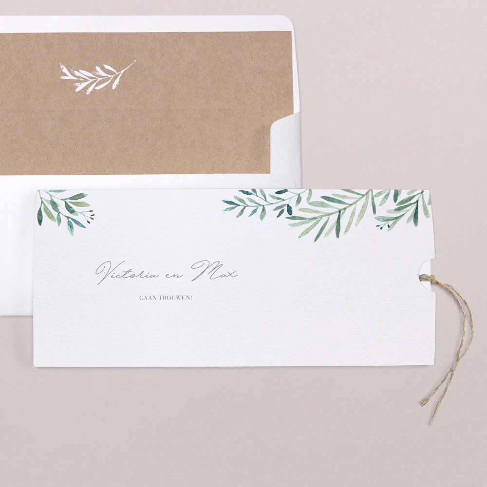 Trouwkaart van wit tekenpapier, Canson stijl, gesloten door een band en een labeltje en vastgebonden met een lintje naar keuze (optioneel).