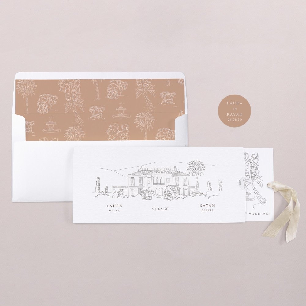 Een prachtig landgoed wordt geschetst op de trouwkaart French Riviera. Weelderige vegetatie en bescheiden bergen verfraaien dit model: perfect om met elegantie jullie bruiloft in Zuid-Frankrijk aan te kondigen.
