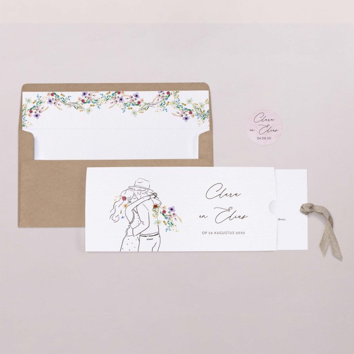 Een stel dat elkaar innig omhelst, accenten met bloemen en zachte kleuren – de trouwuitnodiging Bohemian Dream geven op subtiele en symbolische wijze de magie van jullie grote dag weer.