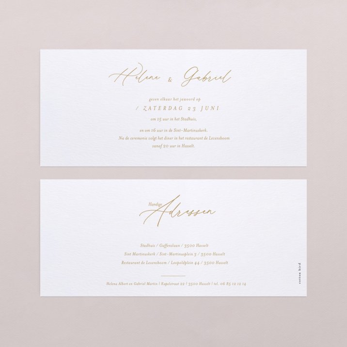 Deze uitnodiging bestaat uit twee eenvoudige kaarten aan beide kanten te personaliseren. Een kalkpapier wordt als een drieluik rond de kaarten gewikkeld.