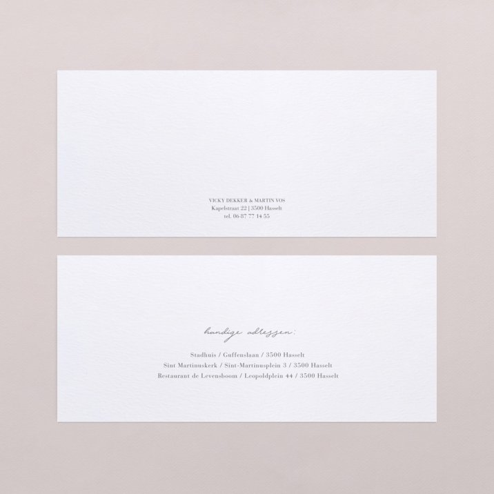 Deze uitnodiging bestaat uit twee eenvoudige kaarten aan beide kanten te personaliseren. Een kalkpapier wordt als een drieluik rond de kaarten gewikkeld.