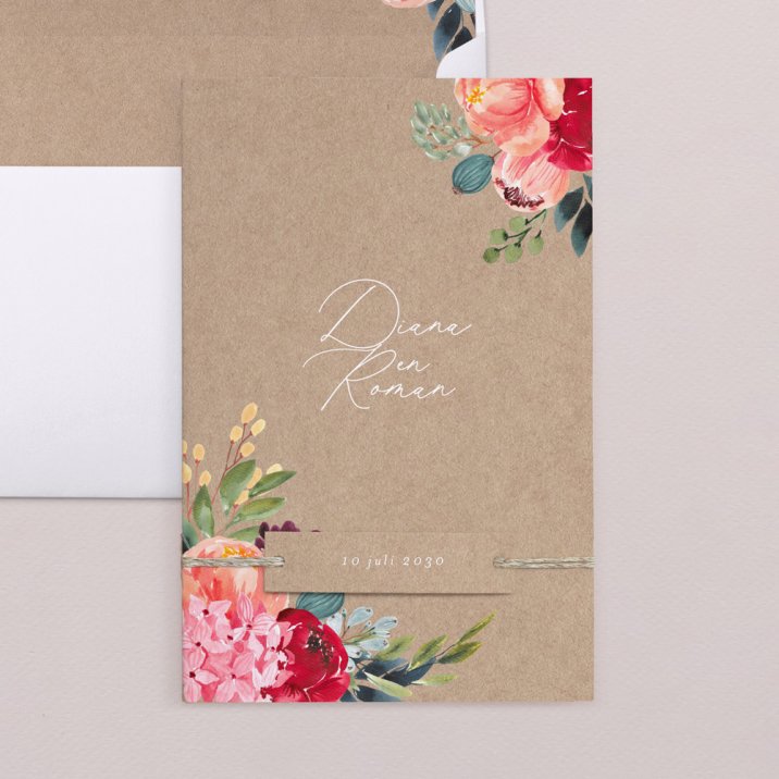 Eenvoud straalt met het mooie contrast tussen zuiver wit, rustiek kraft en zomers bloemen. Steel alle aandacht en kondig jullie mooiste dag aan met het model Red Roses.