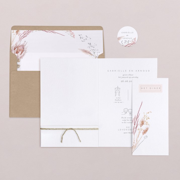 Gedroogde bloemen, een zacht briesje, vrienden en familie als getuige op jullie feest van verbintenis... geef een eerste sfeerbeeld mee van jullie huwelijk met het model Protéa.