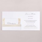 Deze uitnodiging is een vierkante vouwkaart met een hoesje aan de linker binnenkant. Het bijhorende inlegkaartje kan in het hoesje worden geschoven.