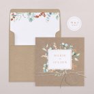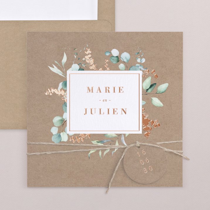 Verwonder je gasten met de trouwkaart Symphonia waar de speling tussen kraft & wit, fijne koperfolie en prachtige eucalyptus blaadjes alle aandacht stelen. Deze elegante trouwuitnodiging weerspiegelt de sfeer van de bruiloft, die zowel in het thema van landelijk, bohemian als vintage chic kan zijn.