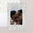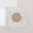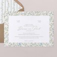 Op de trouwkaart Green wall is een weelderige tuin met bladeren en delicate kleurrijke bloemen te zien. Een romantisch ontwerp met landelijke accenten, perfect om een huwelijk in de lente of zomer aan te kondigen.