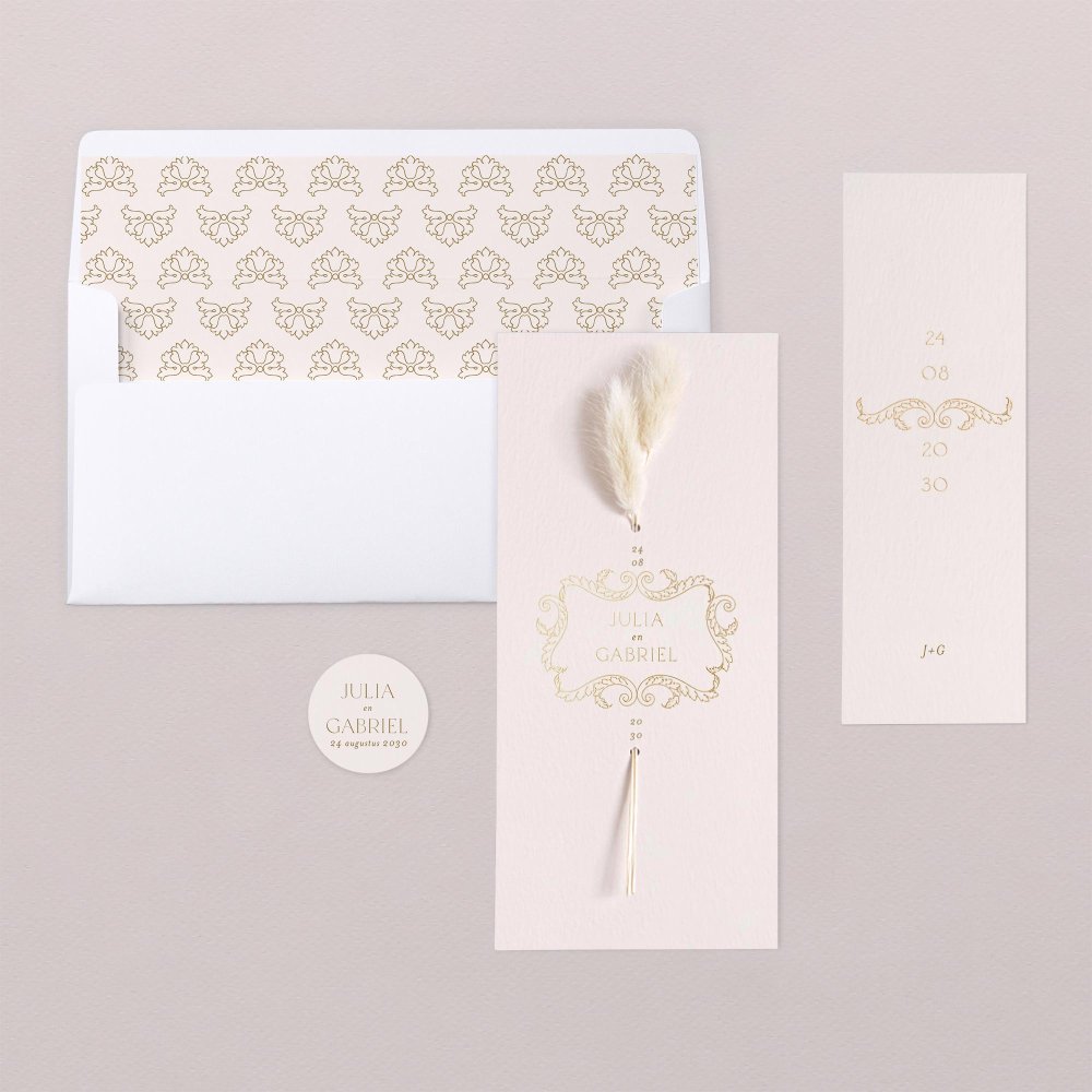Deze uitnodiging bestaat uit een kaart met dubbele flap en een boekenlegger.