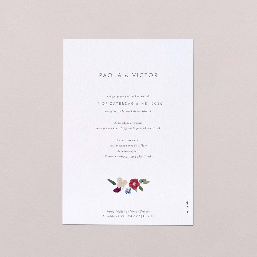 Deze trouwkaart is een enkele staande kaart met scherpe hoeken. Zowel de voor- als achterkant kan je bewerken met eigen tekst.