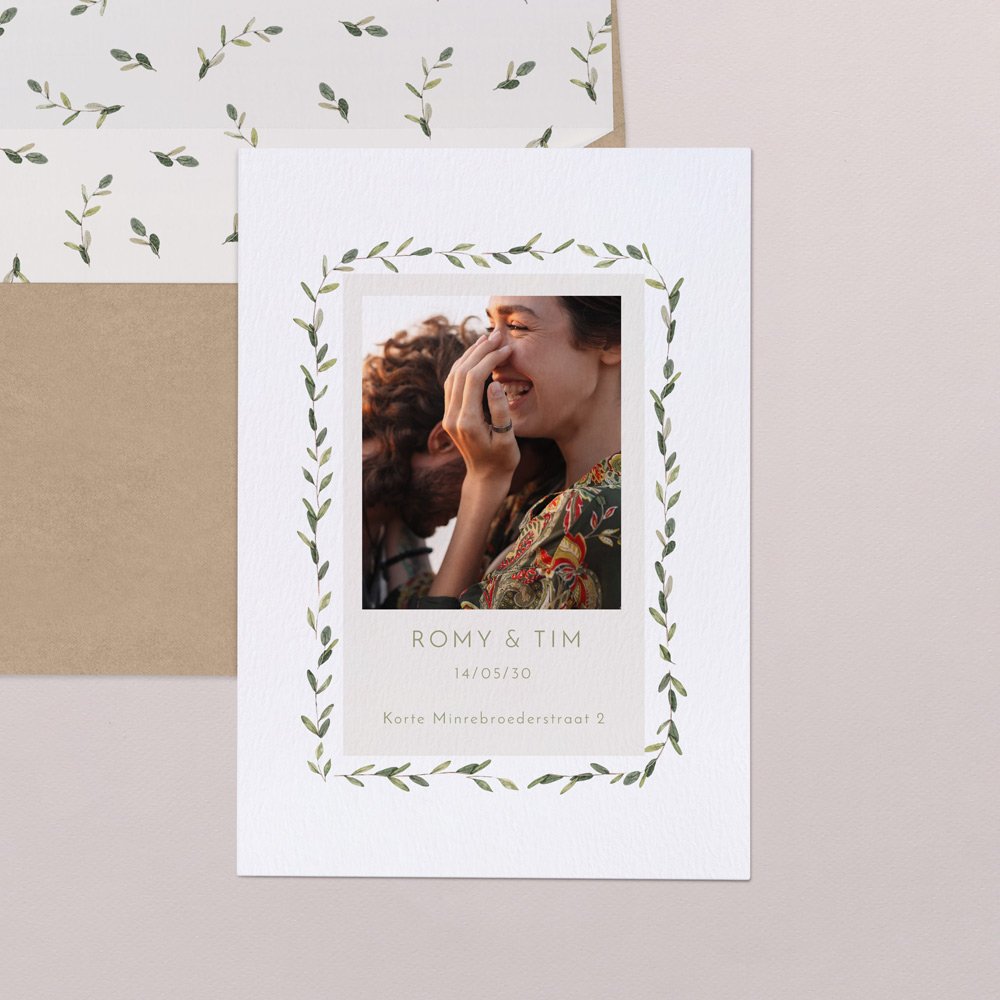 Pastel en een takjeskrans omhullen een sprekende foto van het aanstaande bruidspaar. Deze trouwkaart geeft een botanische moderne uitstraling aan de aankondiging van een elegante bruiloft buiten in de tuin.