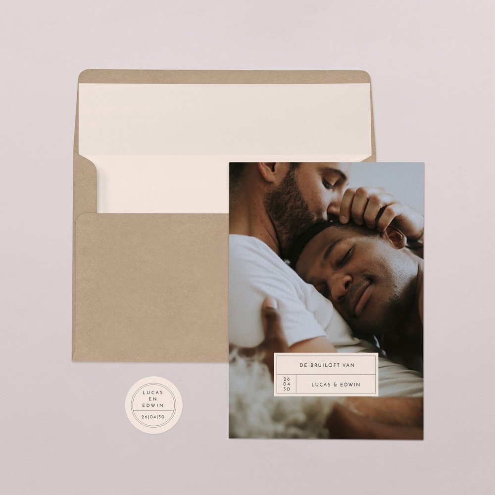 Een sprekende verlovingsfoto staat centraal op deze trouwkaart. Strakke tekstvlakken wisselen zich af met zachte kleuren, een moderne speling voor een bruiloft in het thema van casual chic!
