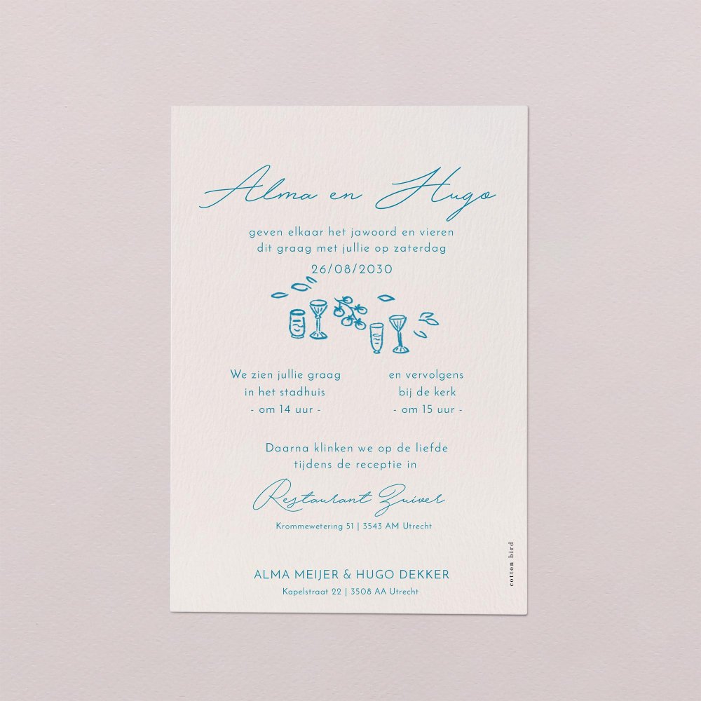 Deze trouwkaart is een enkele staande kaart met scherpe hoeken. Zowel de voor- als achterkant kan je bewerken met eigen tekst.