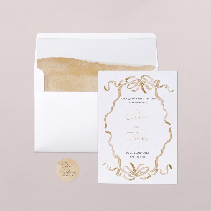 Op de Organdi trouwkaart omhult een lint, geschilderd in aquarel, de namen van het bruidspaar die in glimmend gouden letters op de kaart zijn geplaatst. Deze uitnodiging straalt elegantie en verfijndheid uit, en voorspelt daarmee een chique ceremonie die absoluut niet gemist mag worden.