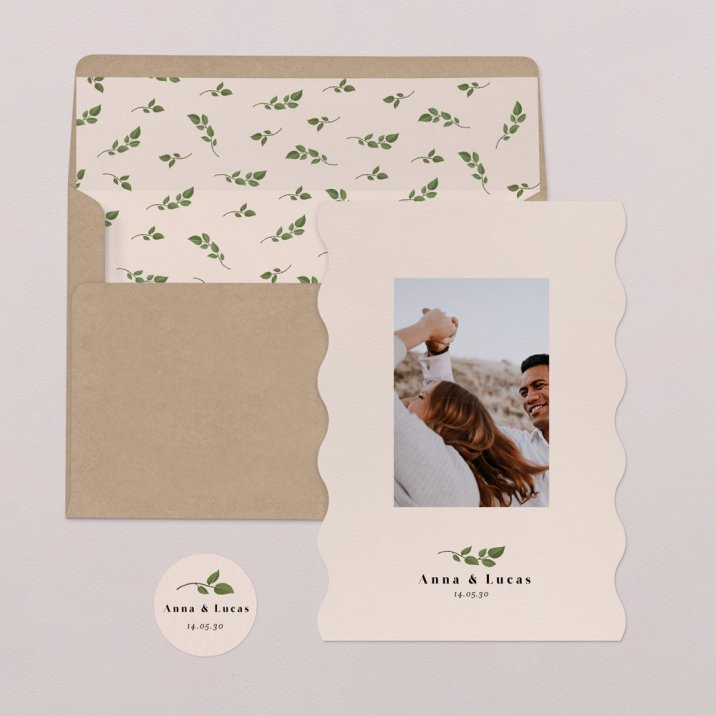 Sommige trouwkaarten hebben ruimte voor foto’s van het koppel. Kies vakantiefoto’s of alledaagse momenten. Voor een professioneel resultaat is een verlovingsshoot ideaal.