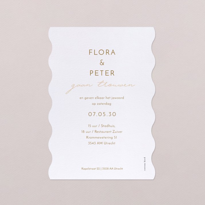 Kies best twee contrasterende lettertypes: een sierlijk voor de namen, een klassiek voor de tekst. Het lettertype weerspiegelt jullie stijl: elegant voor chic, modern voor hedendaags, speels voor origineel.