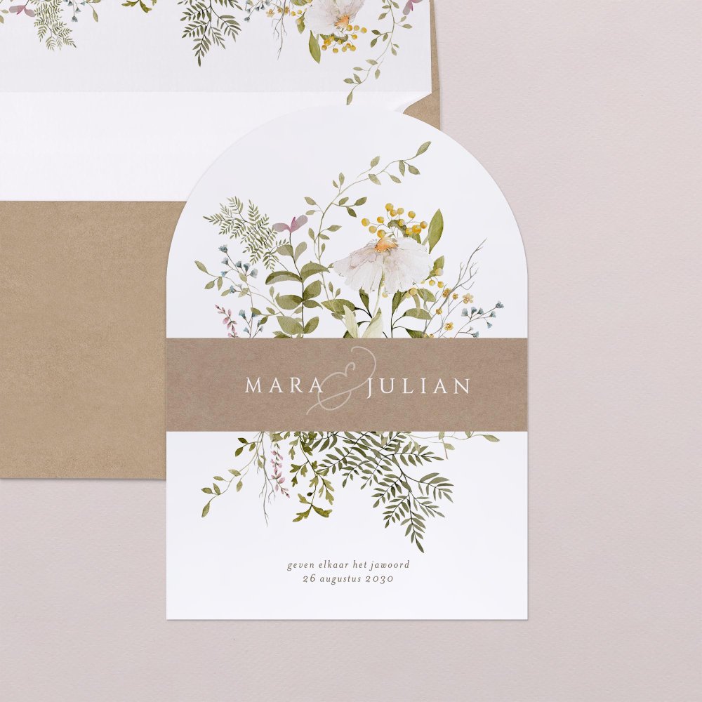 Een boeket van varens, kruiden en kleine bloemen vermengt zich op de trouwkaart Arpèges. Het kraftpapier en de elegante typografie completeren deze samenstelling met een landelijke uitstraling, ideaal voor een natuurlijk chique bruiloft.