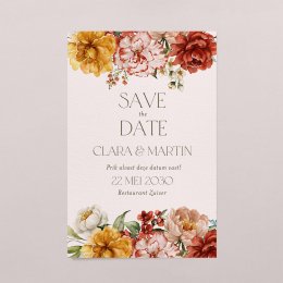 Weelderige gekleurde bloemen sieren de trouwkaart Agostino en brengen een vleugje heerlijke retro charme aan de aankondiging van jullie mooie dag. Een perfecte creatie voor een "ja" gepland in het voorjaar of in de late zomer.