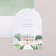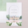 Op de trouwkaart van Médicis, laat een delicate aquarel de locatie van jullie receptie zien aan jullie gasten. Een elegant tafereel, perfect voor een chique landelijke bruiloft.