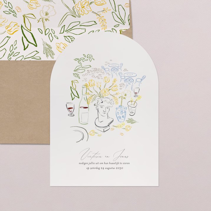 Deze trouwkaart wordt gekenmerkt door zijn afgeronde bovenranden in de vorm van een boog en kan aan de voor- en achterkant worden gepersonaliseerd met de details van jullie trouwdag.