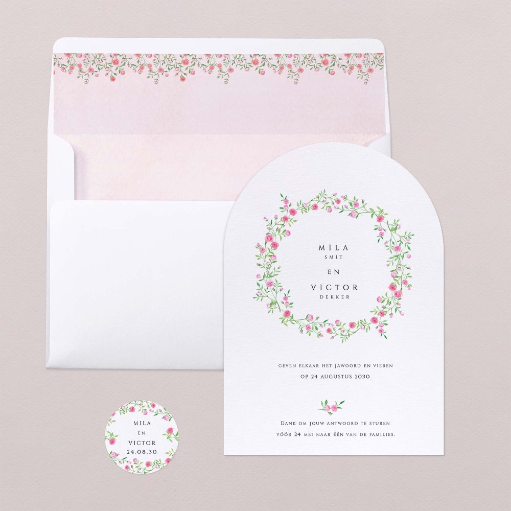 Op de trouwkaart Round Romance prijkt een sierlijk geschilderde krans van roze bloemen om jullie heugelijke aankondiging te omringen. Dit verfijnde en romantische drukwerk kondigt jullie naderende huwelijk op tedere wijze aan.