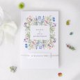Op de Spring Wildery huwelijksuitnodiging staan sierlijke veldboeketten rond de namen van de bruid en bruidegom. Een prachtig aquarel in bohemian tinten, perfect om je kleurrijke lente- of zomerbruiloft aan te kondigen.
