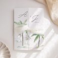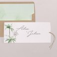 Deze trouwuitnodiging is een staande kaart met een centraal paneel en twee zijpanelen die openvouwen om de belangrijkste details van jullie speciale dag te onthullen. De zijpanelen kunnen gesloten blijven met een mooi lint (optioneel).
