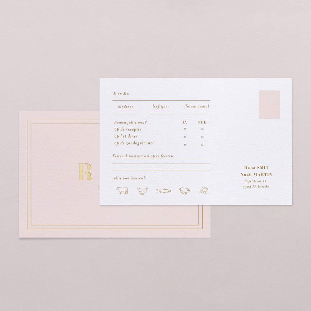 Verstuur deze RSVP-kaart samen met jullie trouwuitnodiging. De gasten hoeven de kaart alleen nog in te vullen en te retourneren als een postkaart, dankzij de voorziene plaats voor een postzegel en jullie vooraf ingevulde adres.