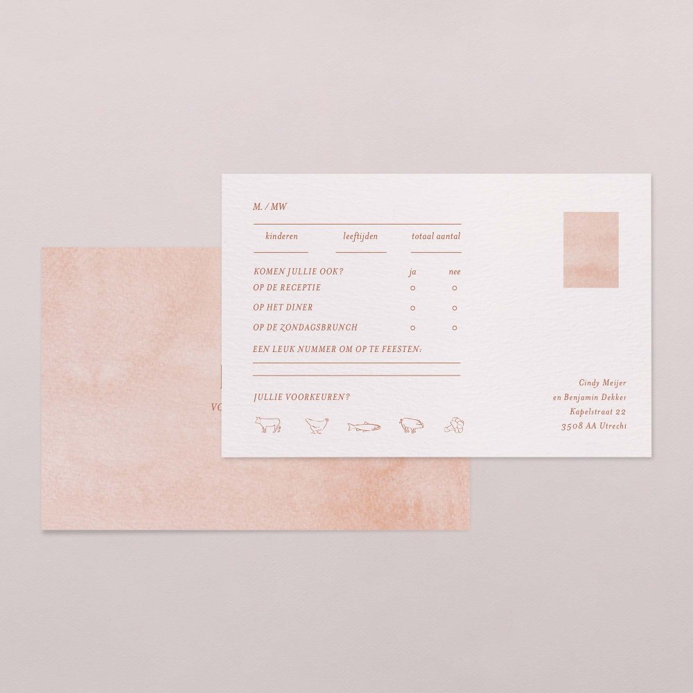 Als aansluitend item voor jullie trouwkaart, geeft deze RSVP-kaart jullie gasten de gelegenheid om hun aanwezigheid snel en gemakkelijk te bevestigen. Zo krijg je een mooi overzicht van het aantal deelnemende volwassenen en kinderen, de dieetwensen en op welke hits er graag geswingd mag worden!