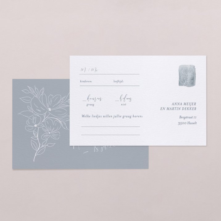 Verstuur deze RSVP-kaart samen met jullie trouwuitnodiging. De gasten hoeven de kaart alleen nog in te vullen en te retourneren als een postkaart, dankzij de voorziene plaats voor een postzegel en jullie vooraf ingevulde adres.