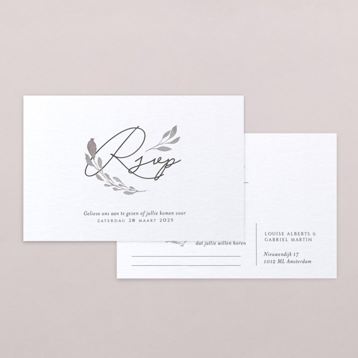 Verstuur deze RSVP-kaart samen met jullie trouwuitnodiging. De gasten hoeven de kaart alleen nog in te vullen en te retourneren als een postkaart, dankzij de voorziene plaats voor een postzegel en jullie vooraf ingevulde adres.