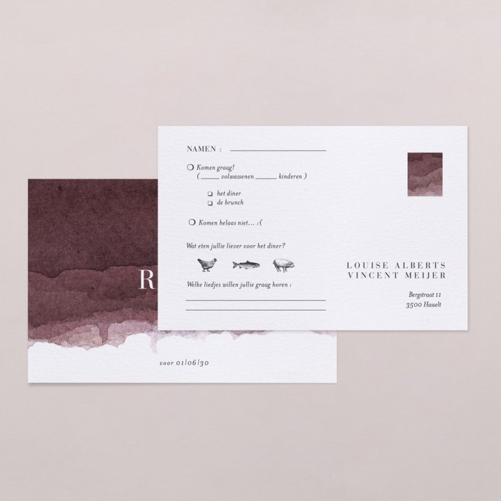 Verstuur deze RSVP-kaart samen met jullie trouwuitnodiging. De gasten hoeven de kaart alleen nog in te vullen en te retourneren als een postkaart, dankzij de voorziene plaats voor een postzegel en jullie vooraf ingevulde adres.