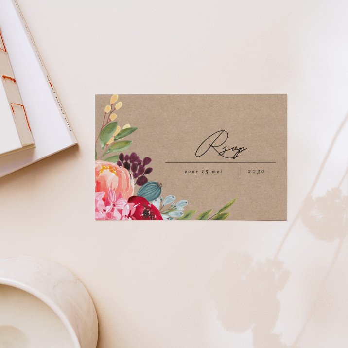 Verstuur deze RSVP-kaart samen met jullie trouwuitnodiging. De gasten hoeven de kaart alleen nog in te vullen en te retourneren als een postkaart, dankzij de voorziene plaats voor een postzegel en jullie vooraf ingevulde adres.