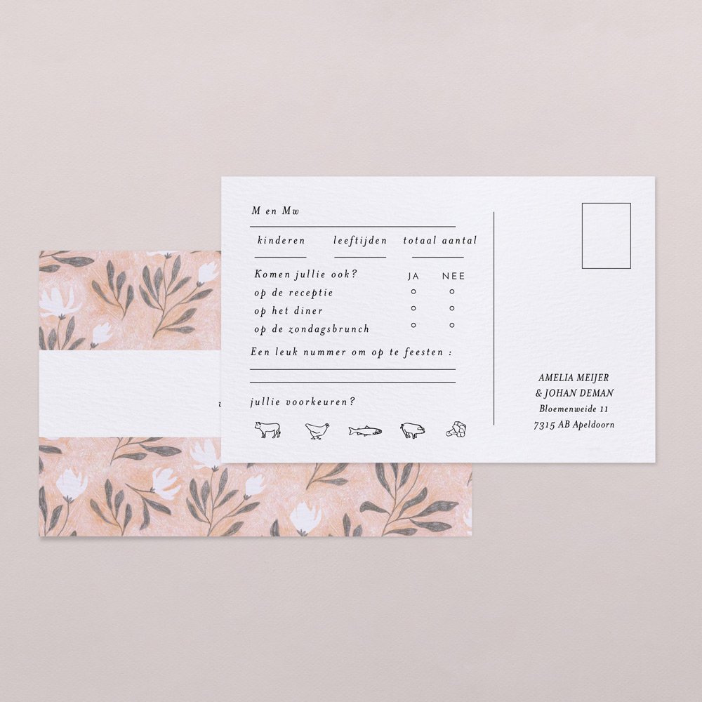 Verstuur deze RSVP-kaart samen met jullie trouwuitnodiging. De gasten hoeven de kaart alleen nog in te vullen en te retourneren als een postkaart, dankzij de voorziene plaats voor een postzegel en jullie vooraf ingevulde adres.