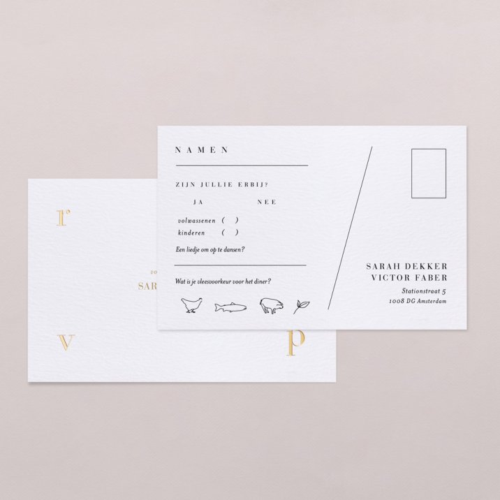 Verstuur deze RSVP-kaart samen met jullie trouwuitnodiging. De gasten hoeven de kaart alleen nog in te vullen en te retourneren als een postkaart, dankzij de voorziene plaats voor een postzegel en jullie vooraf ingevulde adres.