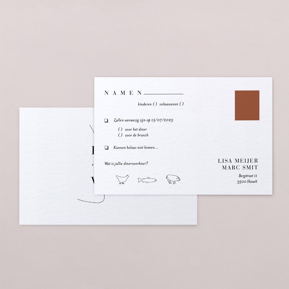 Een RSVP trouwkaart is in verschillende stijlen verkrijgbaar bij Cotton Bird en geheel aan te passen op jullie smaak en wensen. Maak het je gasten gemakkelijk door bijvoorbeeld het postzegelvakje al van een postzegel te voorzien. Zo hoeven de gasten het kaartje alleen nog maar in te vullen en op de post te doen. Gebruik je het liever niet als een RSVP postkaart, dan kan je het vakje in het online bewerkingstool verwijderen. Bij het bestellen van RSVP kaarten, krijg je ook enveloppen, die de gasten kunnen gebruiken voor het retourneren van de RSVP kaart. Handig wanneer je het dus niet als postkaart wil gebruiken.