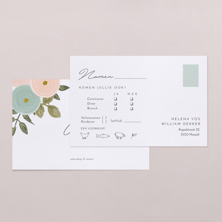 Verstuur deze RSVP-kaart samen met jullie trouwuitnodiging. De gasten hoeven de kaart alleen nog in te vullen en te retourneren als een postkaart, dankzij de voorziene plaats voor een postzegel en jullie vooraf ingevulde adres.