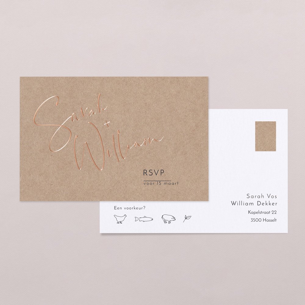 Verstuur deze RSVP-kaart samen met jullie trouwuitnodiging. De gasten hoeven de kaart alleen nog in te vullen en te retourneren als een postkaart, dankzij de voorziene plaats voor een postzegel en jullie vooraf ingevulde adres.