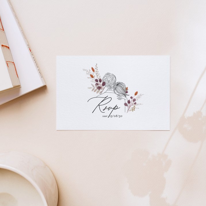 Verstuur deze RSVP-kaart samen met jullie trouwuitnodiging. De gasten hoeven de kaart alleen nog in te vullen en te retourneren als een postkaart, dankzij de voorziene plaats voor een postzegel en jullie vooraf ingevulde adres.