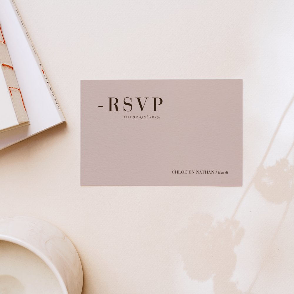 Als aansluitend item voor jullie trouwkaart, geeft deze RSVP-kaart jullie gasten de gelegenheid om hun aanwezigheid snel en gemakkelijk te bevestigen. Zo krijg je een mooi overzicht van het aantal deelnemende volwassenen en kinderen, de dieetwensen en op welke hits er graag geswingd mag worden!