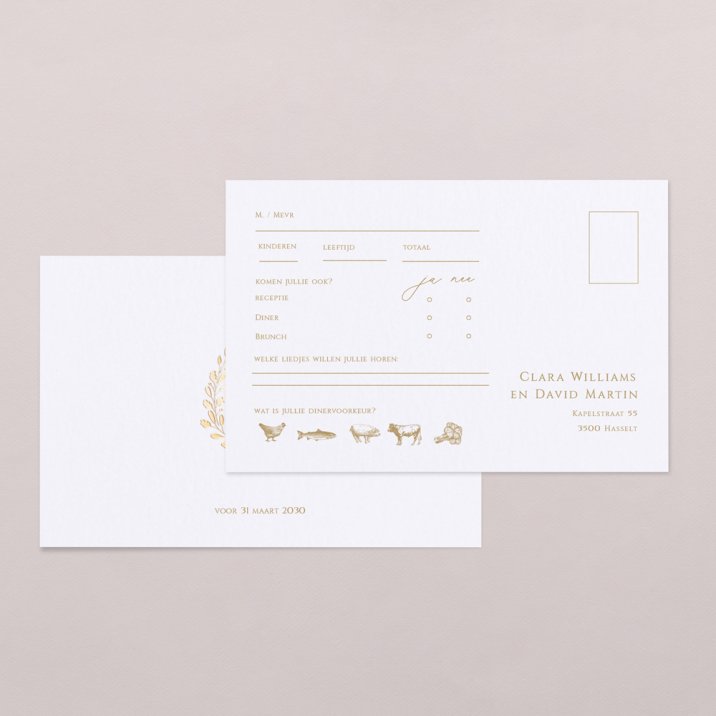 Verstuur deze RSVP-kaart samen met jullie trouwuitnodiging. De gasten hoeven de kaart alleen nog in te vullen en te retourneren als een postkaart, dankzij de voorziene plaats voor een postzegel en jullie vooraf ingevulde adres.