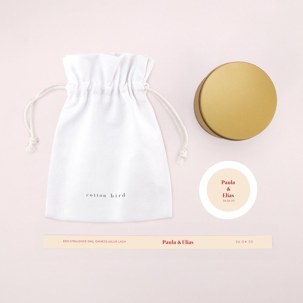 Het elegante gouden doosje kan je zelf personaliseren met de namen van het bruidspaar, de datum van het huwelijk, en een persoonlijke tekst.