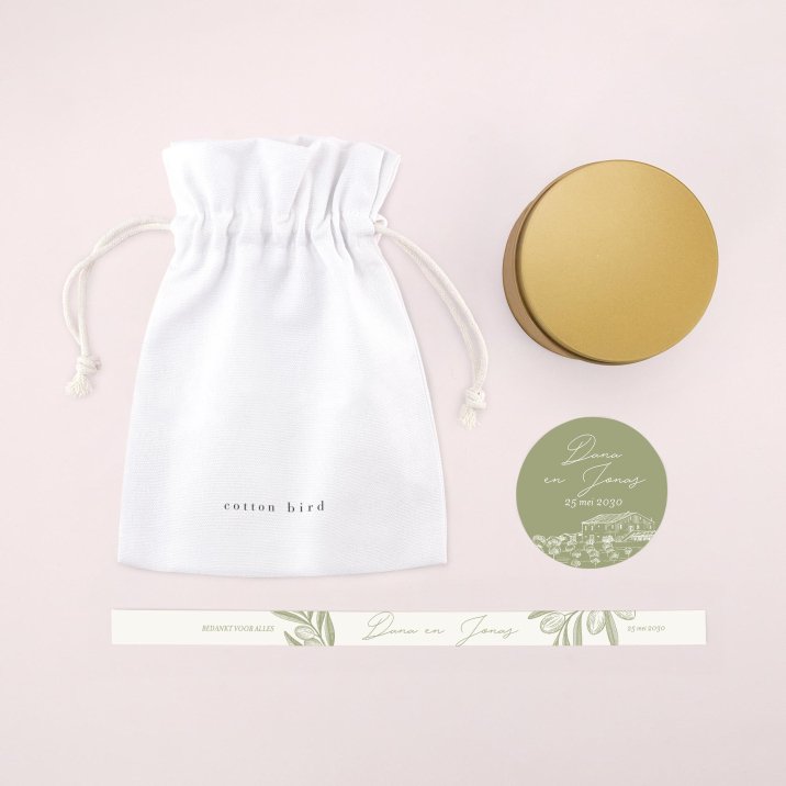 Het elegante gouden doosje kan je zelf personaliseren met de namen van het bruidspaar, de datum van het huwelijk, en een persoonlijke tekst.
