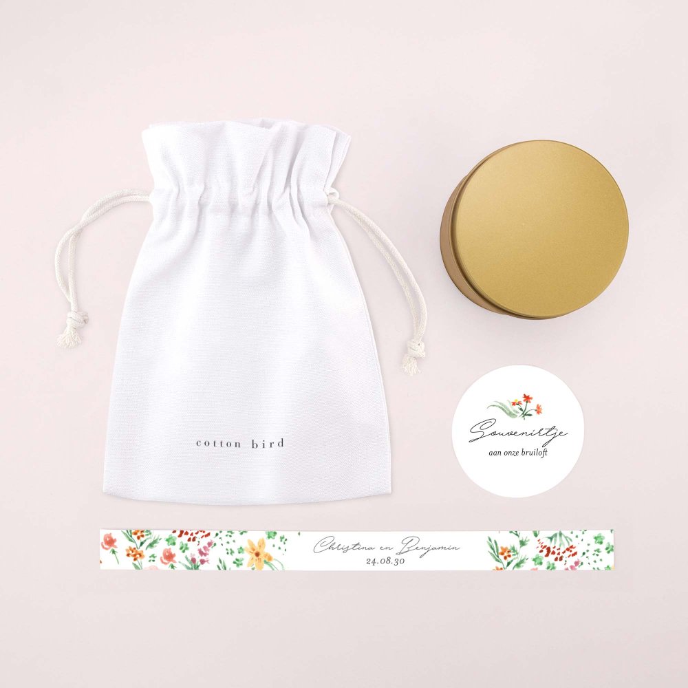 Het elegante gouden doosje kan je zelf personaliseren met de namen van het bruidspaar, de datum van het huwelijk, en een persoonlijke tekst.