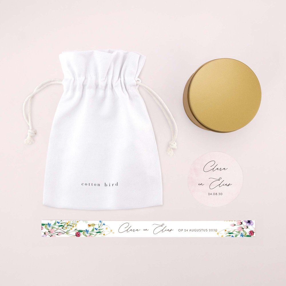 Het elegante gouden doosje kan je zelf personaliseren met de namen van het bruidspaar, de datum van het huwelijk, en een persoonlijke tekst.