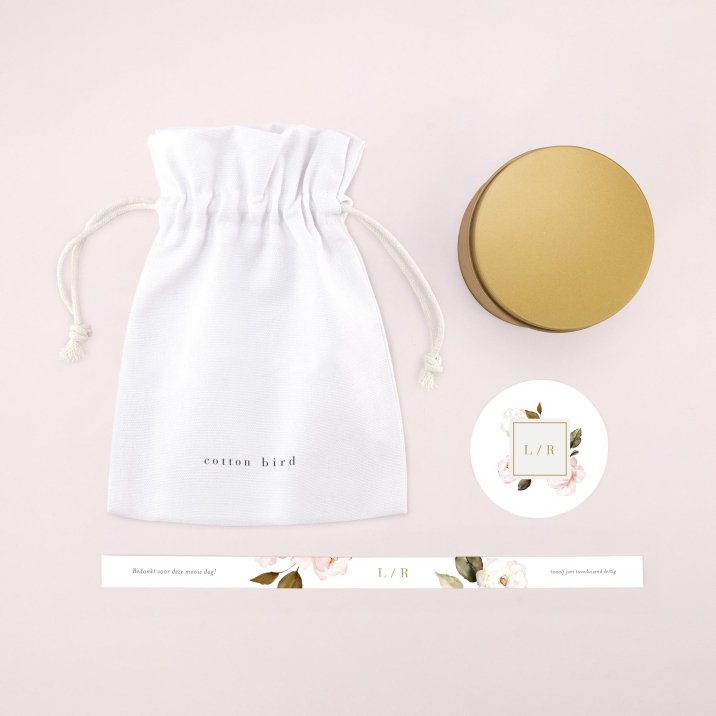 Het elegante gouden doosje kan je zelf personaliseren met de namen van het bruidspaar, de datum van het huwelijk, en een persoonlijke tekst.