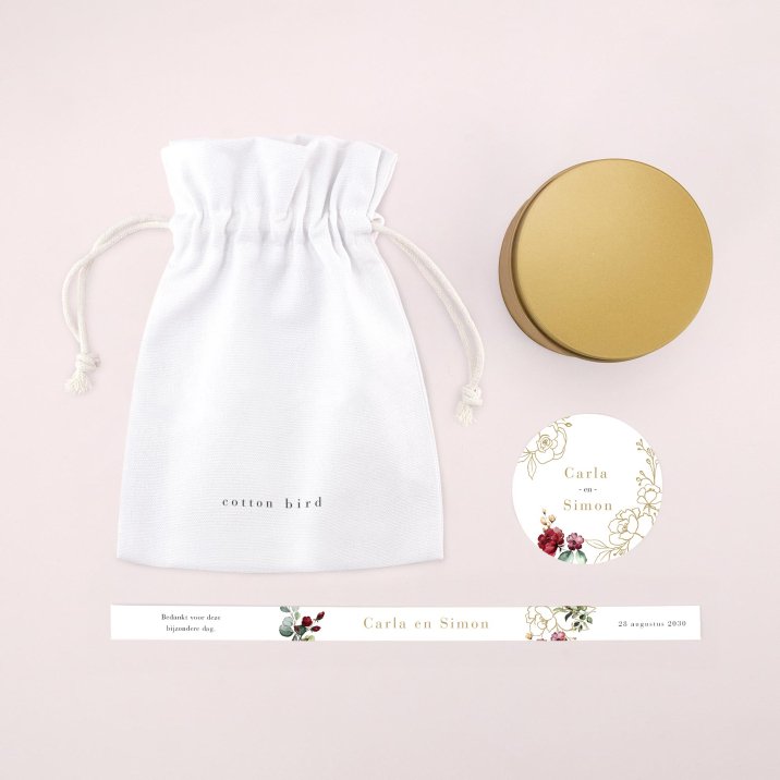 Het elegante gouden doosje kan je zelf personaliseren met de namen van het bruidspaar, de datum van het huwelijk, en een persoonlijke tekst.